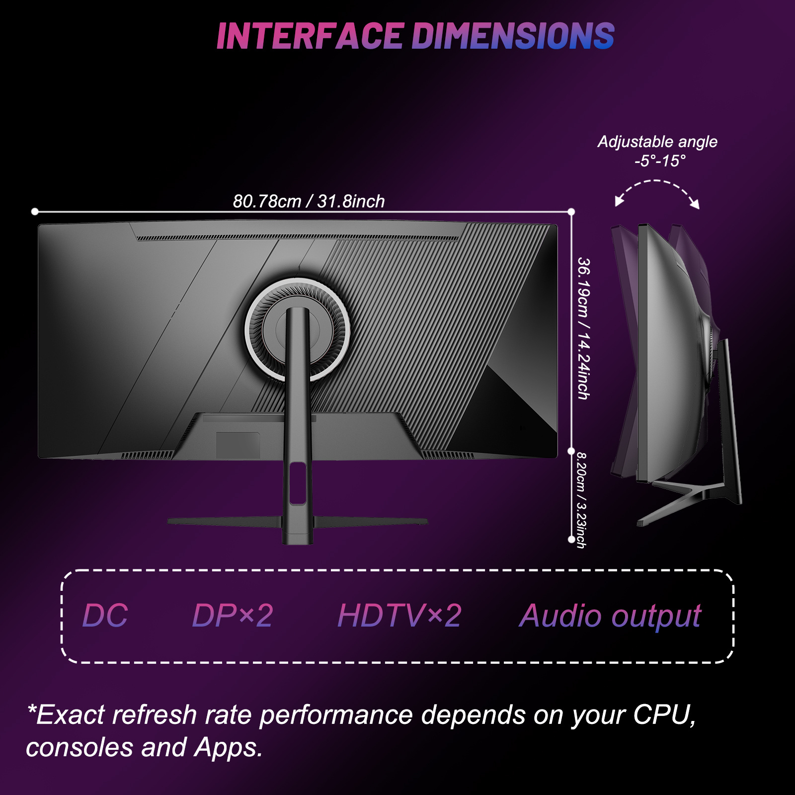 Multiple ports - The gaming monitor offers HDTV 2.1*2 and DP 1.4 *2 for a simple video interface. With a WQHD resolution of 3440 x 1440p, it is compatible with Xbox, PC, laptops and more, ensuring seamless transitions between work and play. Supports HDTV 2.0(up to 120Hz), DP 1.4(up to 165Hz). Exact refresh rate periormance depends on your CPU,consoles and Apps Multiple ports HDTV 2.0*2(up to 120Hz), DP 1.4*2(up to 180Hz). Exact refresh rate periormance depends on your CPU,consoles and Apps 【Low Blue Light & Non-Flickering Screen】The use of DC global dimming technology, can realize a high brush non-Flash screen, after activating the low blue light mode, can effectively filter the short-wave blue light, the prolonged use of the eye remains comfortable.